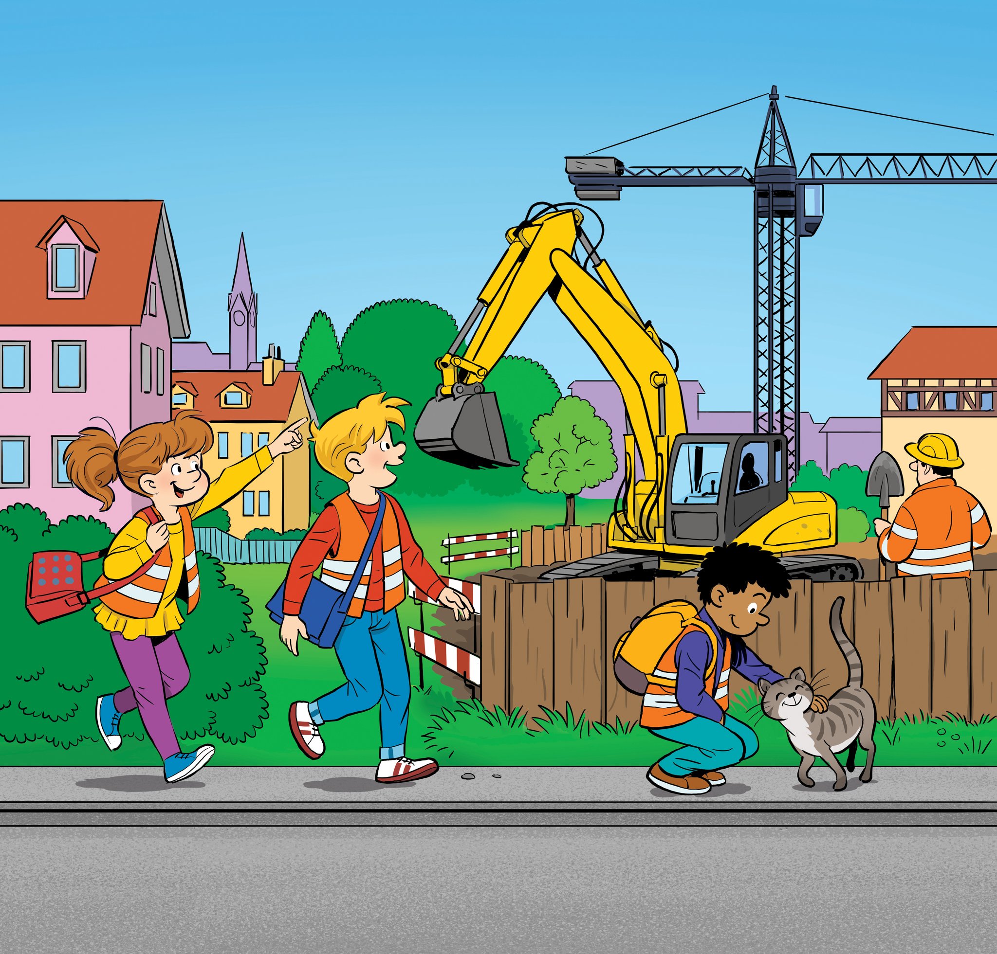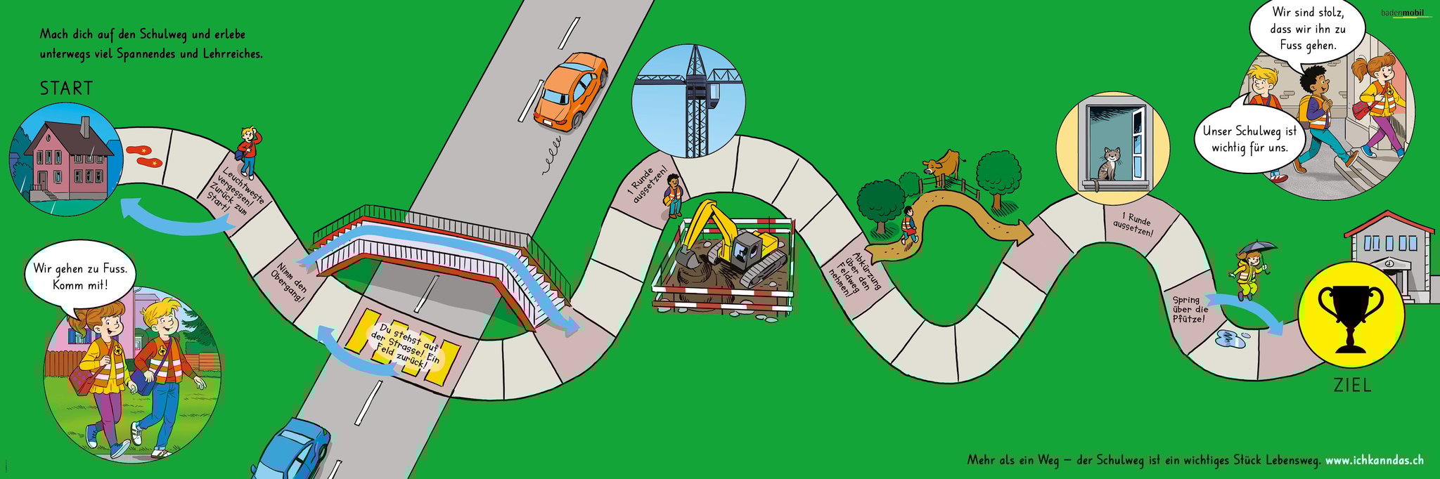 Den Schulwegcomic, gezeichnet vom Globi-Illustrator Samuel Glättli, erhalten Kinder und Eltern vor Kindergartenbeginn zusammen mit den Einteilungsunterlagen und Stundenplänen oder an Elternabenden. Auf den farbenfrohen Seiten werden sie auf die Lern- und Erlebniswelt «Schulweg» mitgenommen.